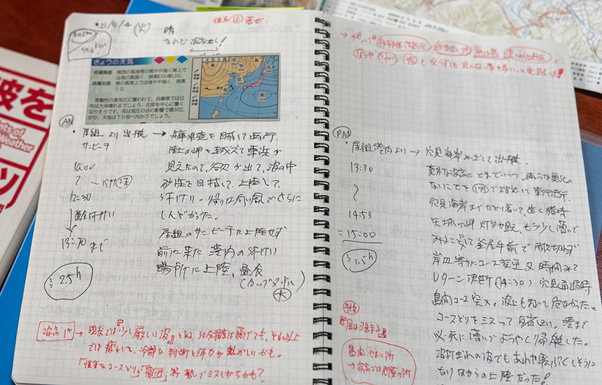 出艇記録は航海日誌のようにその日の様子が書かれており、新聞の天気図を切り取って貼り付けるなど新田さんの几帳面さが伺えます。