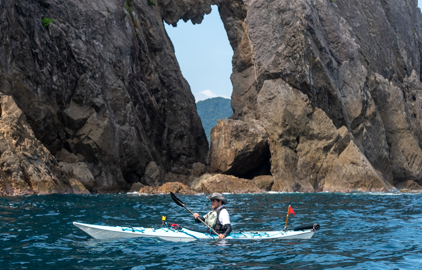 三田浜から出艇、山陰海岸ジオパーク「香住海岸」を時間をかけてゆっくり楽しみます。素晴らしい岩や洞門巡りをしたり、天然記念物の『鎧の袖』、アメリカ原住民の横顔に見える『鷹の巣岩』、カヤックまたはSUPでしか入ることのできない『孔雀洞門』などを間近で見ていただきます。コース上には洞門が数か所あり、実際に入ることも出来る箇所もあります。途中オッパセ浜で休憩、磯遊びをしながら自然の素晴らしさを満喫できるオススメのコースです。