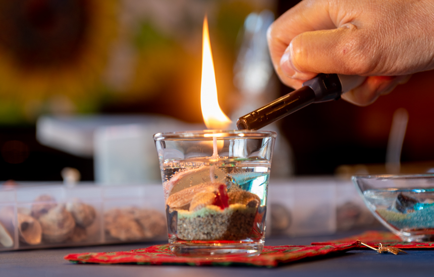 山陰海岸ジオパークに属する神鍋高原にあるペンション「ログリゾートかんなべ」では、貝殻やドライフラワーを使った「ジェルキャンドル」づくりを体験できます。