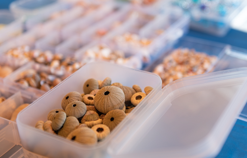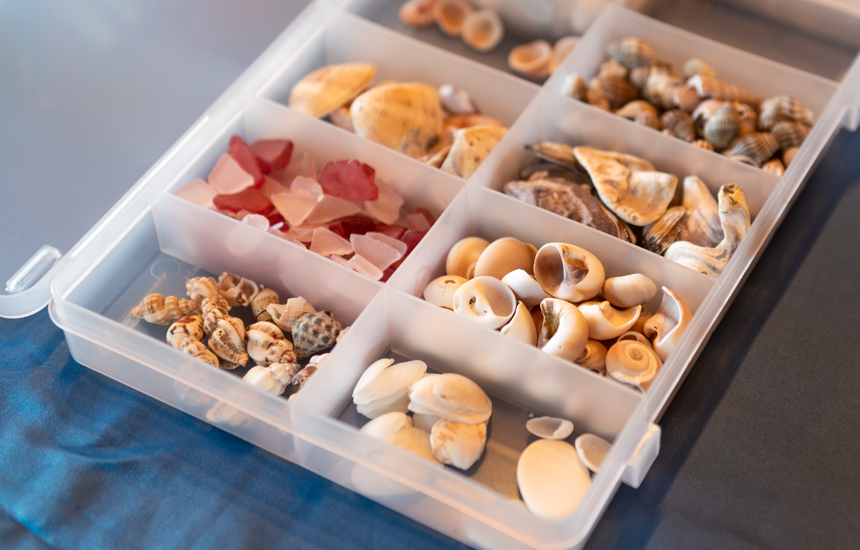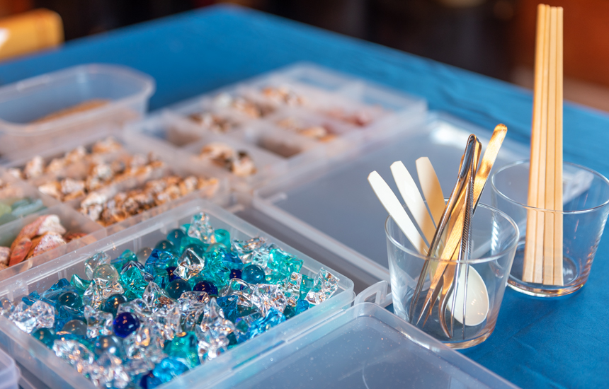 グラスの底に砂を入れ、色とりどりの素材や貝殻を飾ると小さな海ができあがり。